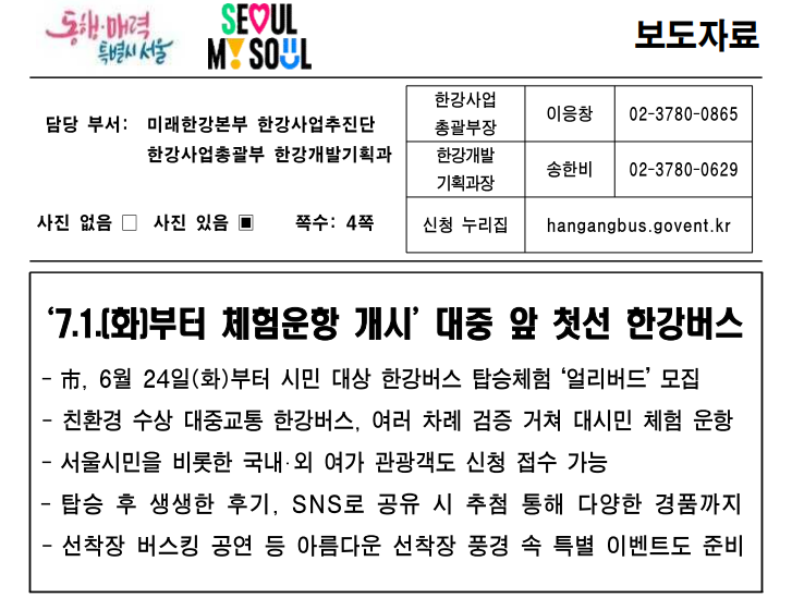 - 기후동행카드: 68,000원 정기권 이용 시 리버버스도 무제한 이용 가능
